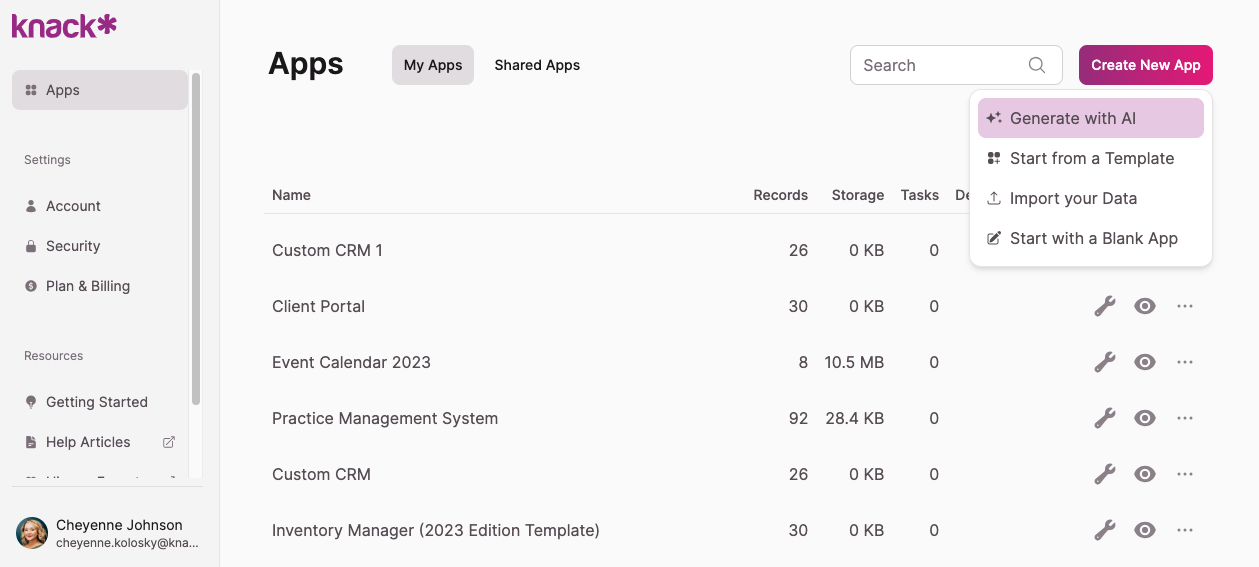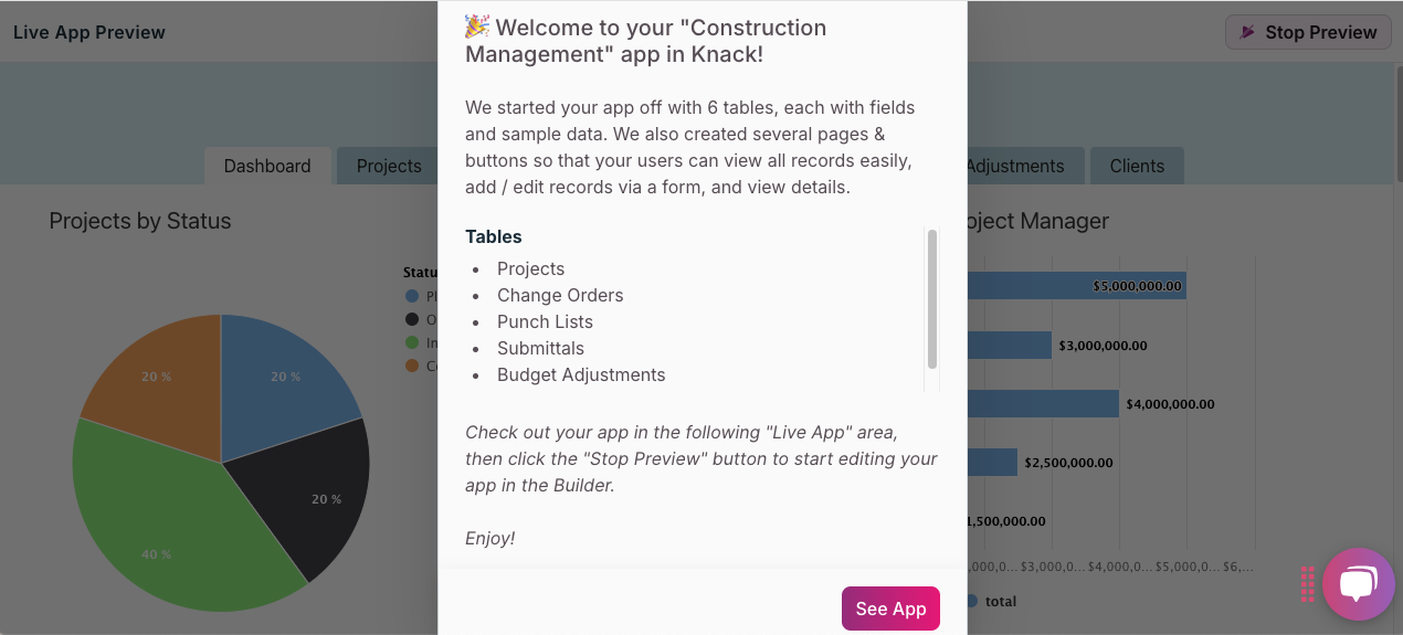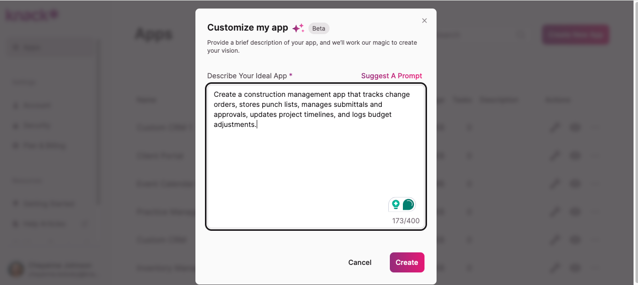Using Knack’s AI App Builder can make creating custom construction management software faster by automating much of the initial setup process. Here’s how to take advantage of this feature: