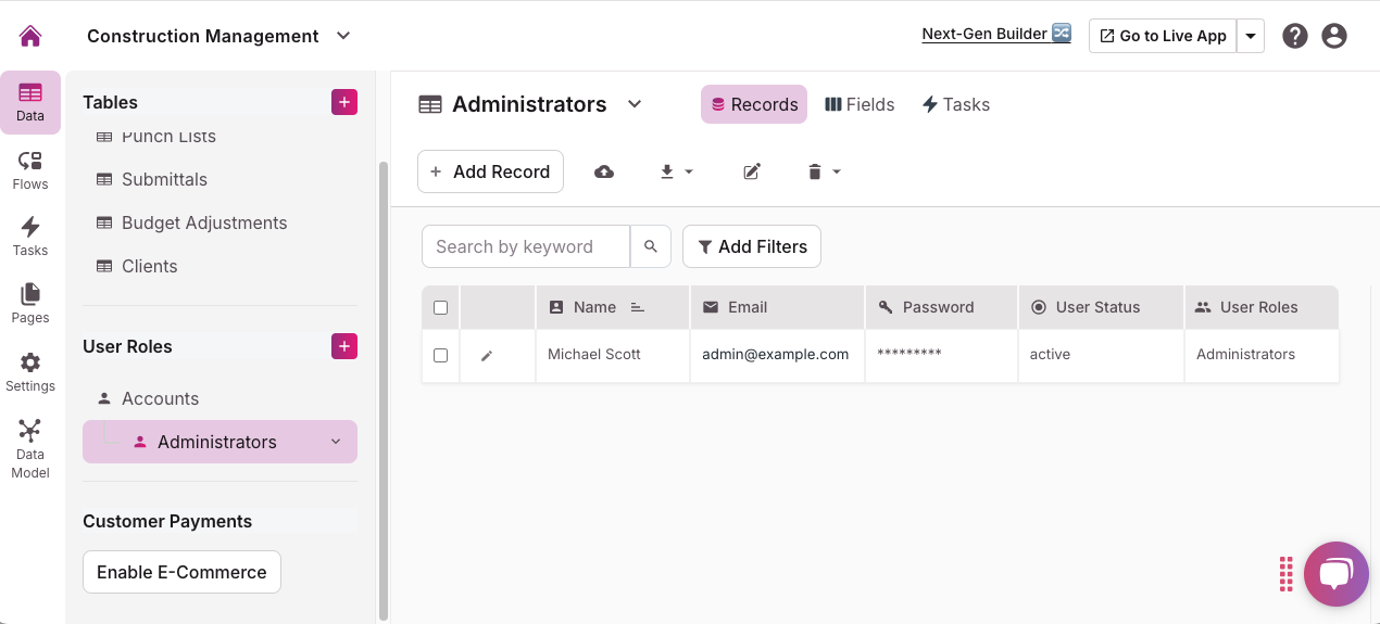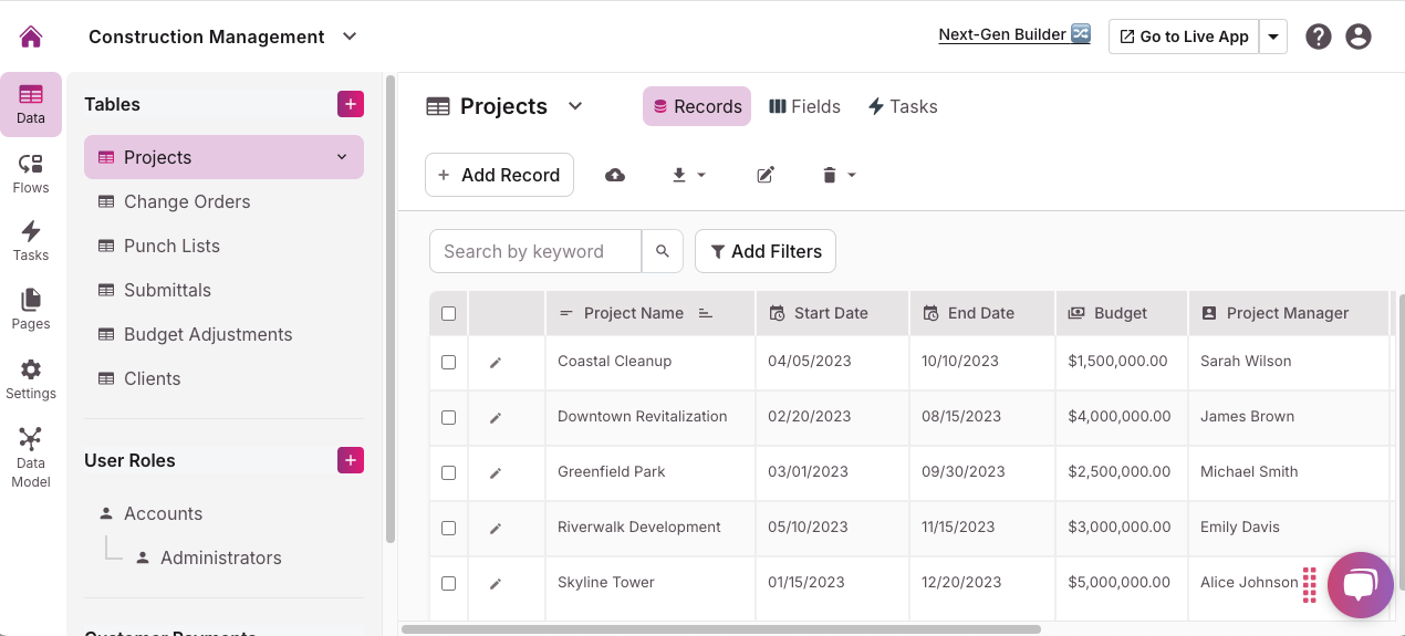 Building your construction management software from scratch with Knack provides flexibility and full control, ensuring that it meets the specific needs of your business.