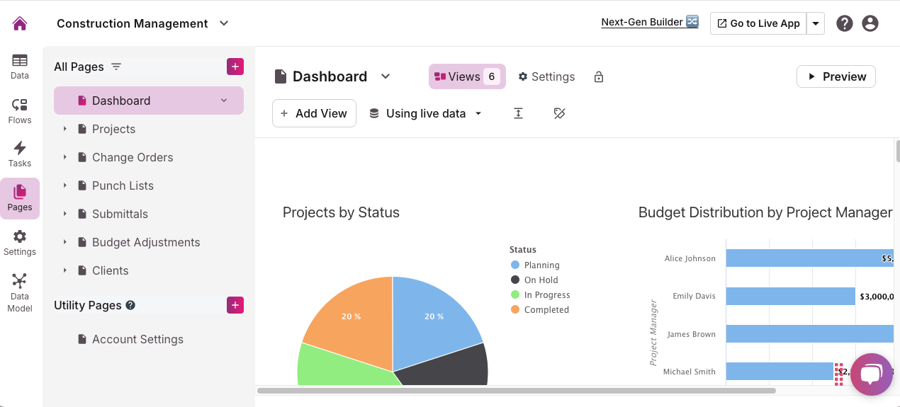 Develop pages for key areas such as Project Dashboards, Budget Reports, and Team Assignments. Add tables, forms, and charts to each page for data visualization and input.