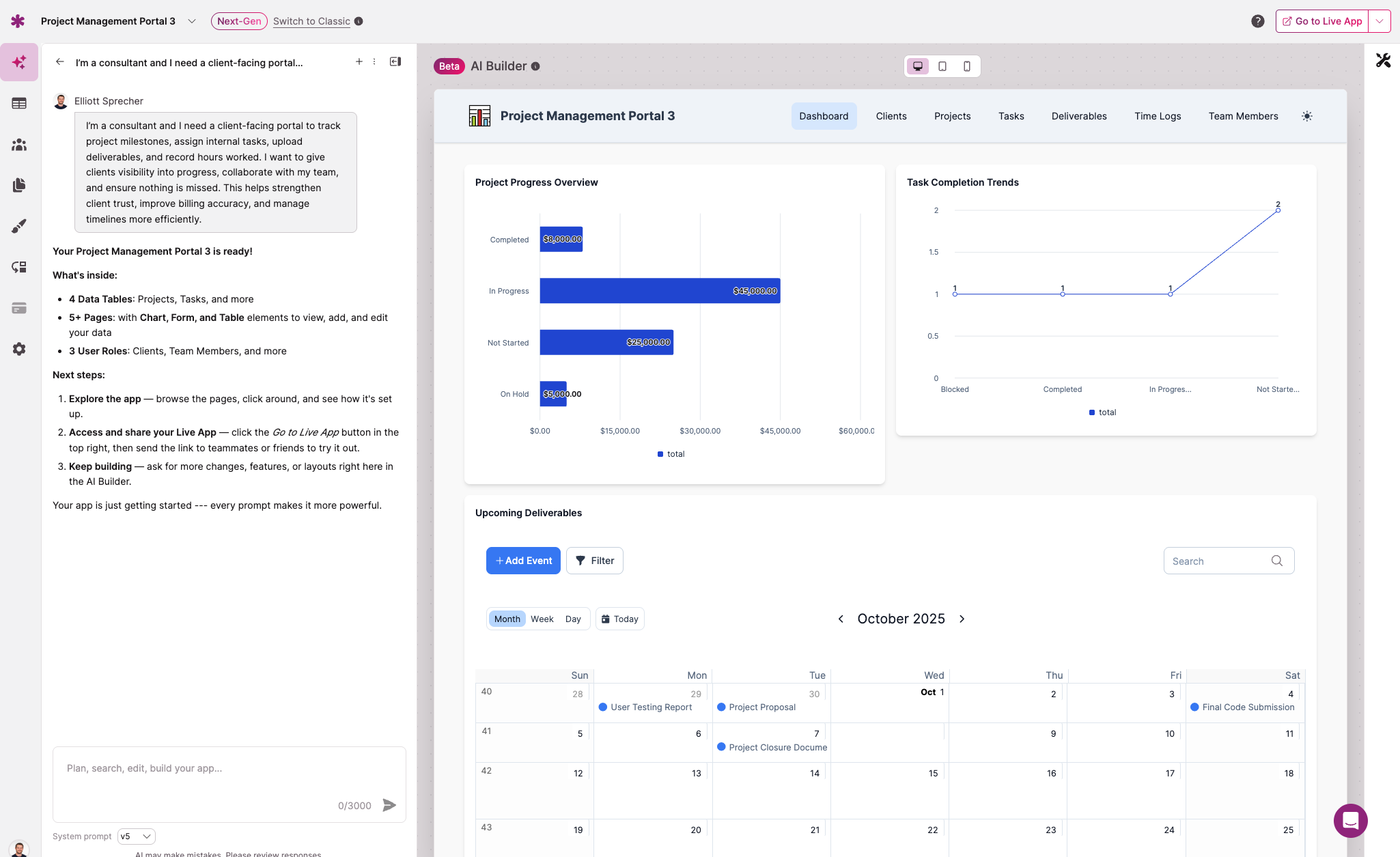 Our new AI app builder turns your ideas into working applications by chatting with AI. Think of it as having your own app developer you can talk to in plain language — no technical knowledge required.