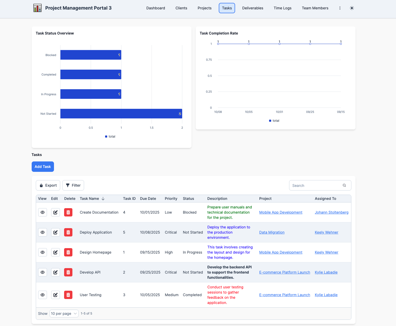 • “Create a dashboard page for Clients showing project status, milestones, and latest deliverables.”