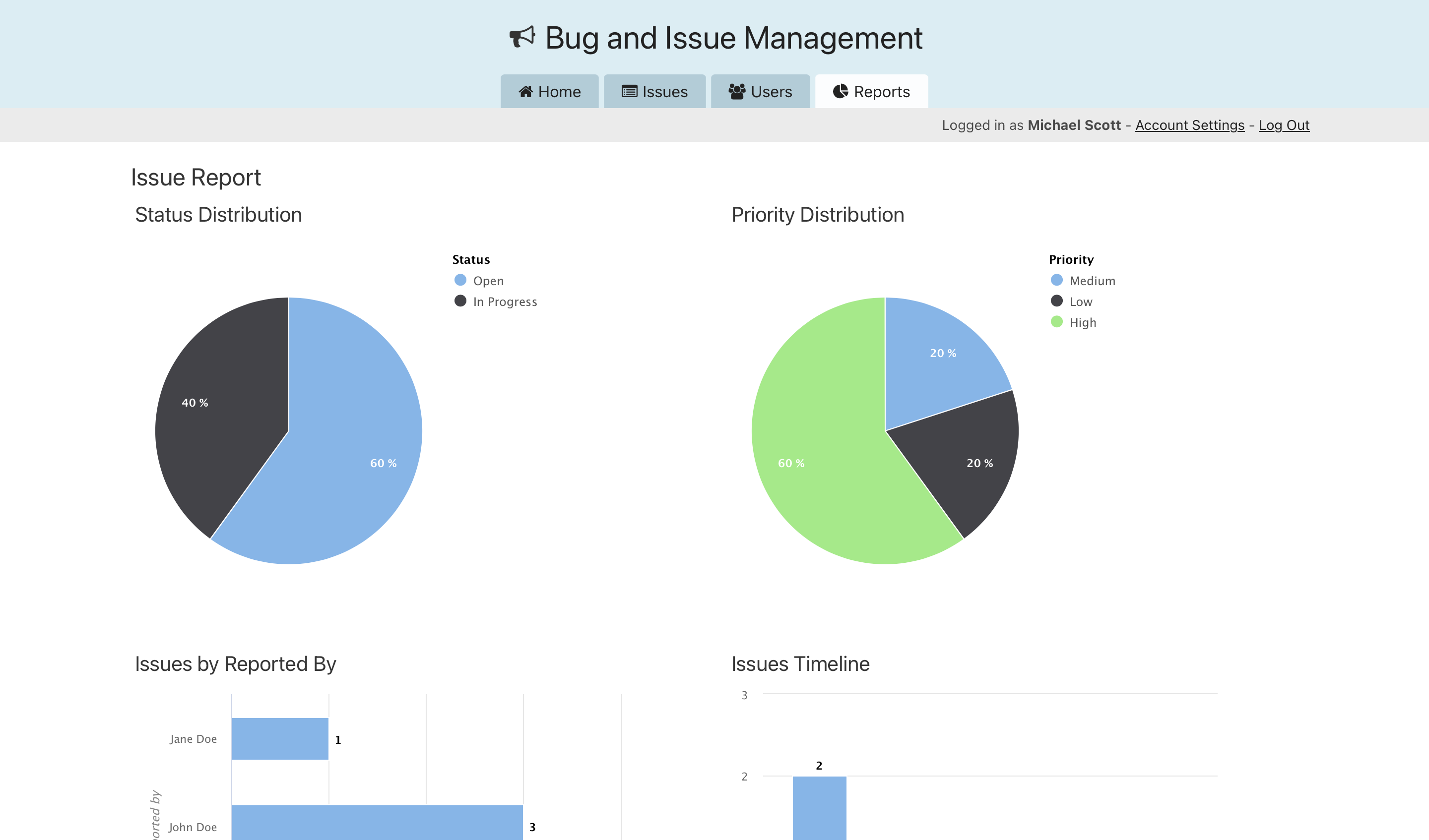 • Dashboard for Project Managers: Project Managers can view project-specific statistics, active issues, and team performance.