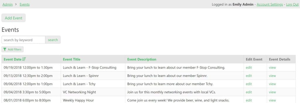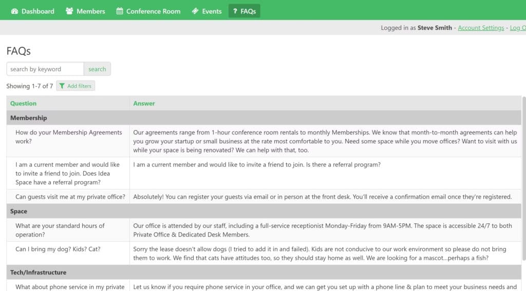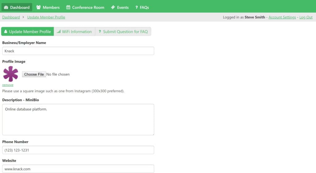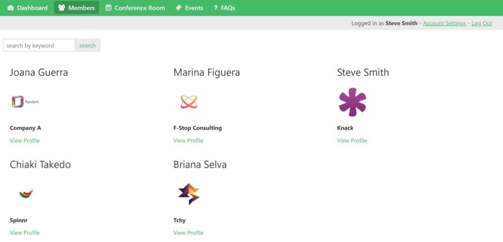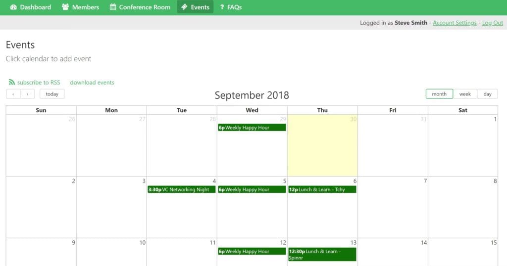 In this coworking member portal, members log in to manage their profile and view other member profiles. They can also organize, view, and register for events in the space. Members can also book rooms for a meeting or phone call. Finally, members can see important information about the space such as Wifi credentials, operating hours, and guest policy.