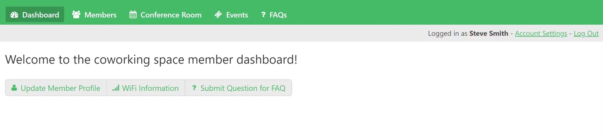 In this coworking member portal, members log in to manage their profile and view other member profiles. They can also organize, view, and register for events in the space. Members can also book rooms for a meeting or phone call. Finally, members can see important information about the space such as Wifi credentials, operating hours, and guest policy.